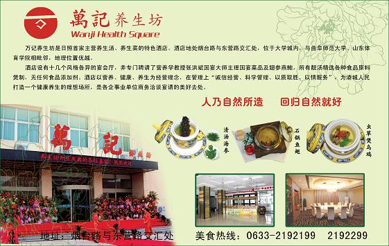 万记养生坊是日照首家主营养生汤、养生菜的特色酒店。酒店地处烟台路与东营路交汇处,位于大学城内,与曲阜师范大学、山东体育学院相毗邻,地理位置优越。 酒店设有十几个风格各异的宴会厅,特聘营养学教授张洪斌大师主理养生菜品,所有养生汤精选原材料蒸制而成,无任何食品添加剂。酒店以营养、健康、养生为经营理念,在管理上“诚信经营、科学管理、以质取胜、以情服务”,为港城人民打造一个健康养生的理想场所,是各企事业单位商务洽谈宴请的理想去处。 |
