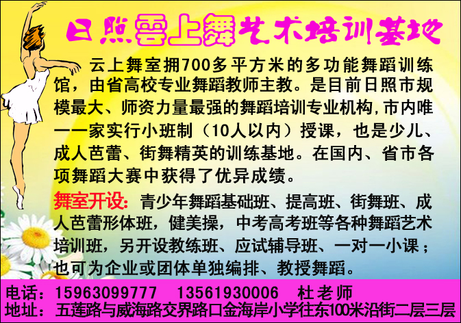 云上舞室是一所专业舞蹈文化艺术推广机构,舞室成立于2004年,拥700多平方米的多功能舞蹈训练馆,由中国教育协会舞蹈研究会理事、中国教育协会舞蹈研究会会员、山东省高校专业舞蹈教师主教,并特邀中国舞蹈家协会资深艺术家为艺术顾问。是目前日照市模最大、师资力量最强的舞蹈培训专业机构,市内唯一一家实行小班制(10人以内)授课,也是少儿、成人芭蕾、街舞精英的训练基地。一流的教学环境、一流的教学师资、一流的教学服务,经过几年耕耘培育了大量优秀的舞蹈人才,在国内、省市各项舞蹈大赛中获得了优异成绩。 舞室开设:青少年舞蹈基础班、基础提高班、街舞班、成人芭蕾形体班等各种舞蹈艺术培训班,还设有:晚班、周末班、假期班等;另开设教练班、应试辅导班、一对一小课;也可为企业或团体单独编排、教授舞蹈。