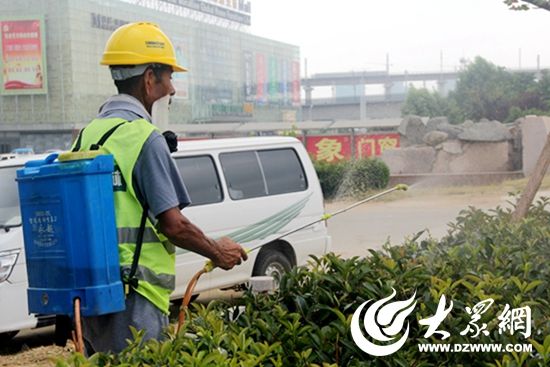 园林工人正在为绿篱喷撒蒸腾抑制剂