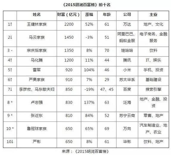 近日,胡润研究院发布内地《2015胡润百富榜》,万达集团董事长王健林登顶内地首富。在富豪榜前10中,有来自马云、马化腾、李彦宏、雷军这样的科技领袖,但整体来看,今年内地富豪榜让人高兴不起来,前10中有一半涉及地产,他们是万达集团王健林家族(2200亿元)、苏太华系严昊家族(910亿元)、泛海卢志强(830亿元)、苏宁云商张近东(810亿元)、万向集团鲁冠球(650亿元)、华彬集团严彬(650亿元)。