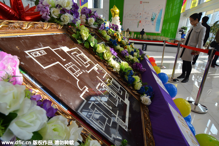 日照市一售楼处,市民在参观用巧克力做的户型图。当日,该房地产商为了促销,用巧克力做了数个房型平面图,吸引了众多市民围观。