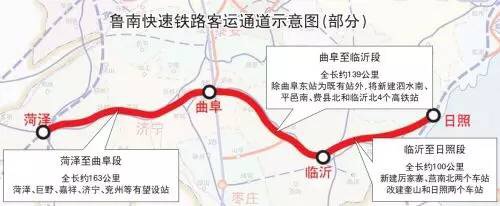 根据规划,鲁南快速铁路客运通道为双线客运专线,设计行车速度为350公里/小时,曲阜至临沂段工程投资估算总额200 .84亿元,建设工期为3年,全线除曲阜东站为既有站外,将新建泗水南、平邑南、费县北和临沂北4个高铁站,已经于去年底开工。