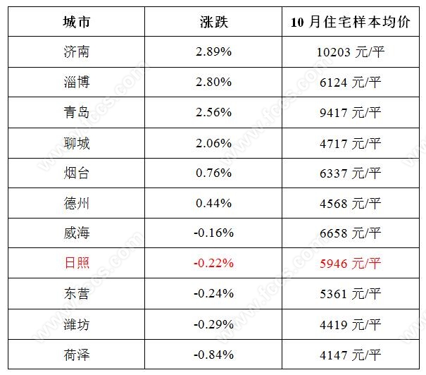 日照10月住宅样本均价5946元/平 环比微降0.22%