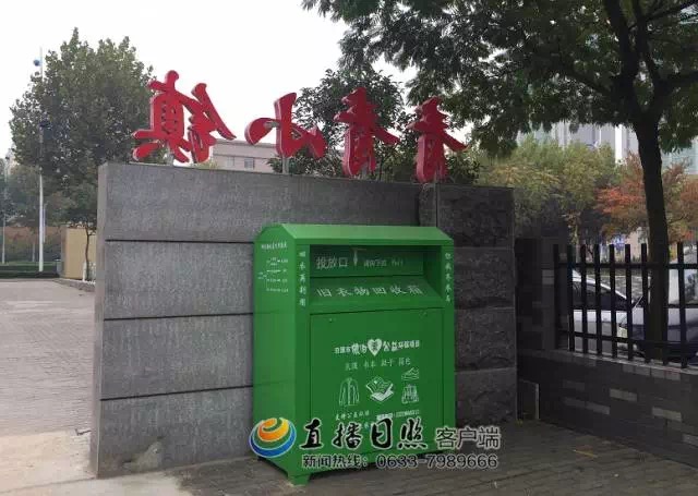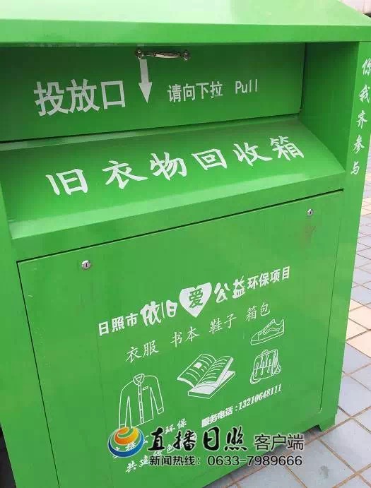 2016年11月7日,直播日照走访了几个小区,发现这些旧衣服捐赠箱或旧衣物回收箱一般放置在小区显眼位置,箱体为环保绿色,正面写着“日照市依旧爱公益环保项目”的字样,箱体下面还写着服务电话,还标有“支持公益环保、共建绿色家园”的口号。